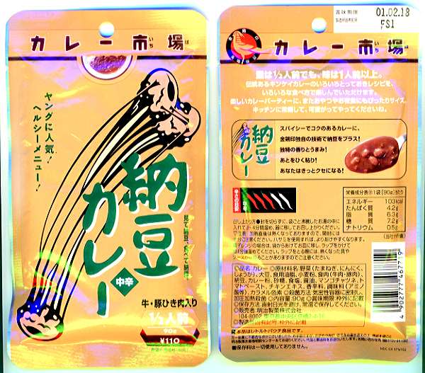 某コンビニ(ファミリーマート)でカレーの企画商品を数種類売ってます。 その中に納豆カレーがありました。 レトルトパウチで二分の一人前サイズです。90グラムで価格は110円です。 ほかの種類(タイカレーや激辛カレーなど)は皆130円であと一種類の欧州風の特製のものが180円です。 納豆カレーは庶民的というか一ランク低い設定です。納豆君のプライドが傷つかないことを祈ります。 画像が悪くてごめんなさい。 (990408)