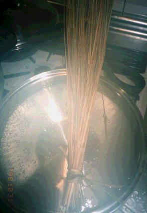 次に、束ねた藁を煮ます。よほど鍋が大きければ一度に煮ることもできましょうが、私は菜箸も使いながら根本の方からだんだんに沸騰したお湯につけていきました。