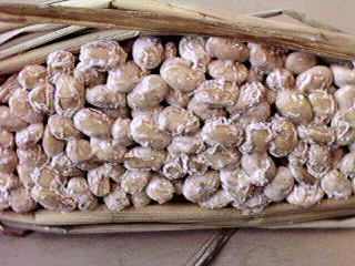 縛った2カ所の間の藁をひらいて蒸しあがった熱い大豆を盛ります。